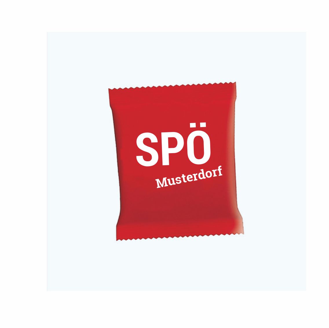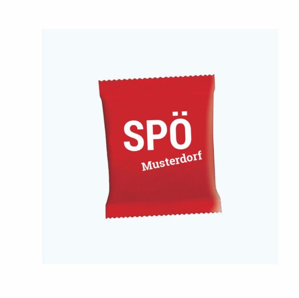Fruchtgummi, ca. 10g, Fruchtbären, aus Fruchtsaftkonzentrat, mindestens 12 Monate haltbar – mit SPÖ Logo und Ortsnamen.