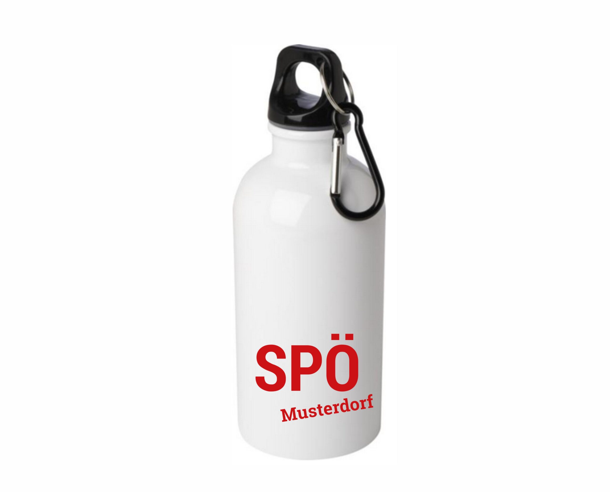 Einwandige Flasche mit Drehdeckel. Veredelung mehrfärbig mit SPÖ Logo und Ortsname oder nach Wunsch. Das Fassungsvermögen beträgt 400 ml. Aluminium.